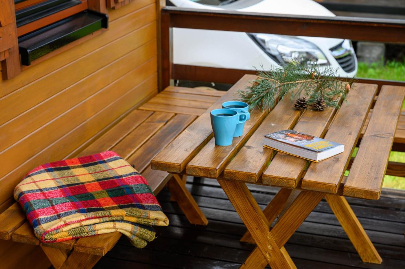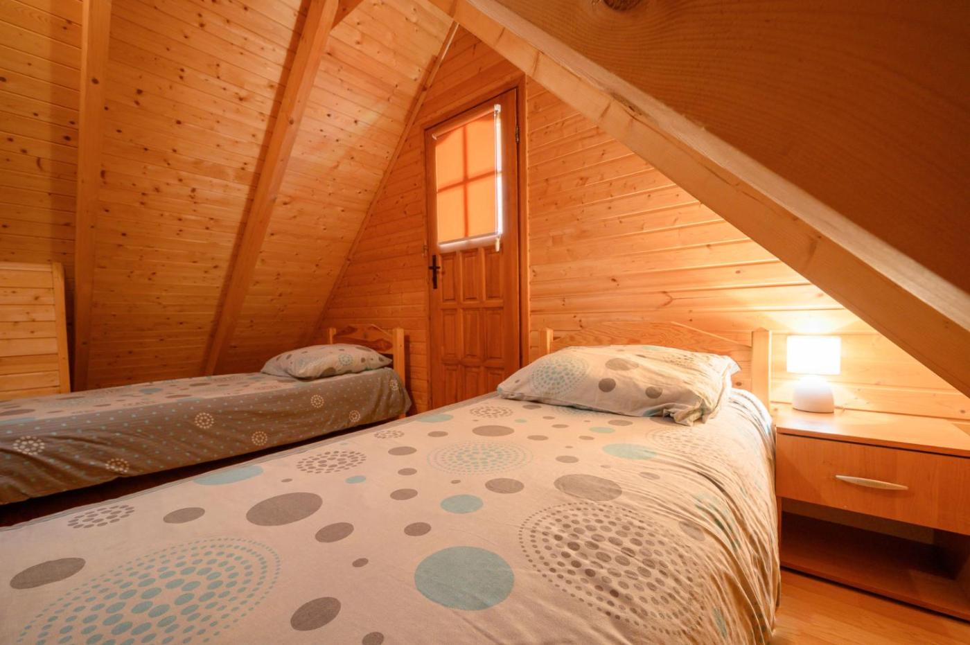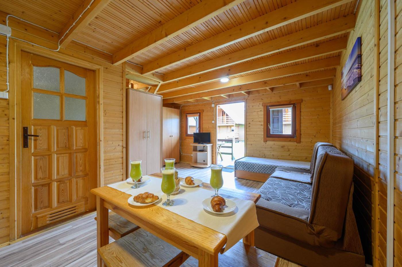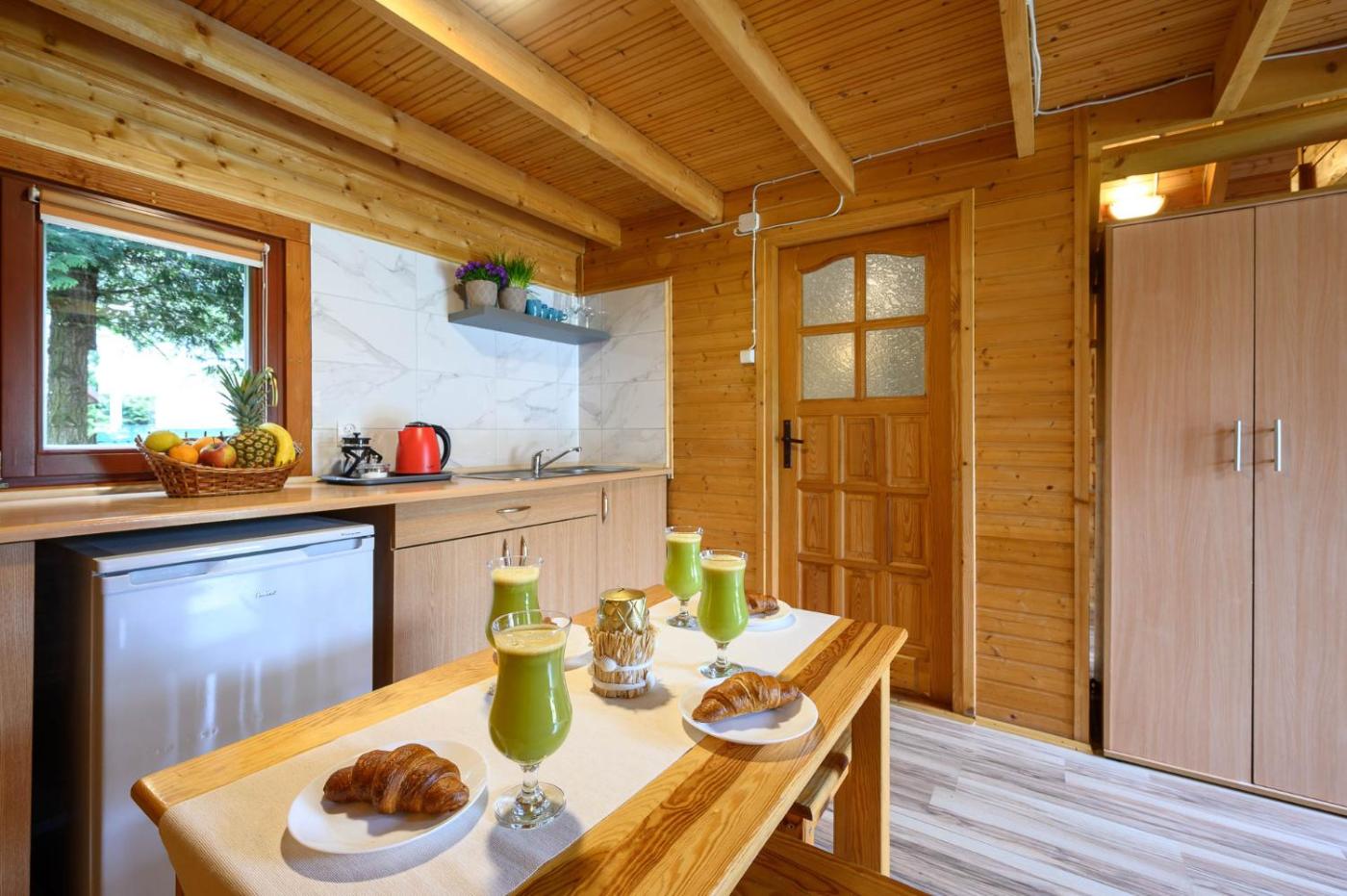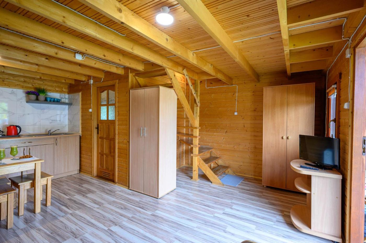Domek z 2 sypialniami. This chalet includes 1 living room, 2 separate bedrooms and 1 bathroom with a shower and a hairdryer. Guests will find a stovetop, a refrigerator, kitchenware and a tea and coffee maker in the kitchenette. The chalet also features a barbecue. This chalet has a dining area, a wardrobe, a flat-screen TV and a terrace. The unit has 6 beds. Domek - 7 osobowy. Powierzchnia pokoju ok.: 50 mkw.